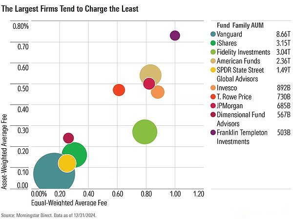 Der Erfolg von Vanguard zeigt sich in den Zahlen, und der Vermögensverwaltungsbereich wird mittlerweile von kostengünstigen passiven Indexfonds dominiert.Die folgende Grafik zeigt deutlich den starken Zusammenhang zwischen niedrigeren Gebühren und einem höheren AUM.