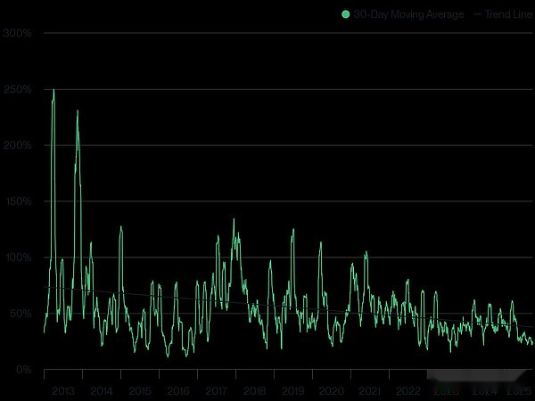 Lo mismo ocurre con Bitcoin.A medida que Bitcoin pasa de ser un usuario pionero a ser un inversor institucional y madura como tecnología, ya no enfrenta los riesgos existenciales que enfrentaba hace una década, y su madurez como clase de activo ha aumentado significativamente.Esto se ve claramente en la volatilidad de Bitcoin, que ha disminuido significativamente desde que el ETF de Bitcoin comenzó a cotizar en enero de 2024.