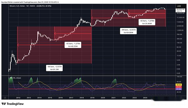 Como se muestra a continuación, 84 meses equivalen a 7 años, y cada 84 meses experimentamos un mínimo significativo.Tomando 42 meses como punto medio del ciclo, también muestra una fluctuación cíclica de bajo a bajo.