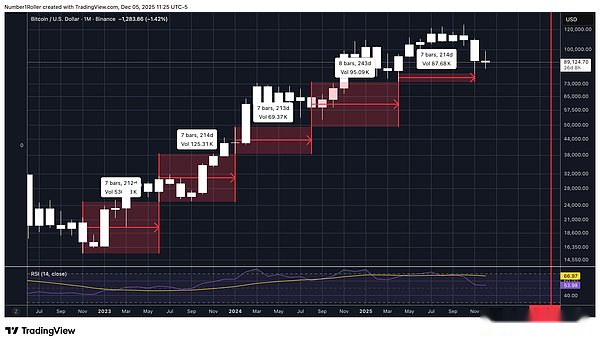 Cuando nos acercamos y observamos este ciclo, también podemos medir el rango de intervalos de tiempo desde el mínimo mensual hasta el mínimo mensual, y encontramos que cada mínimo mensual ocurre exactamente 7 meses después del mínimo importante anterior.