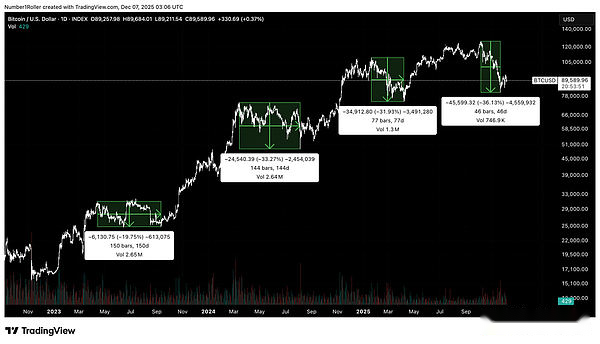 Es precisamente esto lo que se ha pasado por alto en este último retroceso.Mirando hacia atrás en el ciclo anterior de Bitcoin, encontrará que a medida que avanza el ciclo, las fluctuaciones de precios de la corrección se vuelven cada vez más violentas, pero la duración se hace cada vez más corta.Esto indica un mercado fuerte y una volatilidad creciente a medida que se acerca a su pico.
