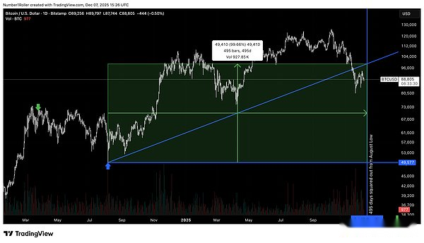 Podemos fortalecer aún más esta relación al cuadrado si echamos la vista atrás a los mínimos de agosto de 2024. El mínimo se produjo en 49577 puntos.Si se extrapola 495 días hacia adelante desde ese mínimo, se obtiene el 13 de diciembre, que está a solo un día del máximo y estacional del año pasado.*Tenga en cuenta que el punto medio de este cuadrado se produce exactamente en el punto más bajo de abril.
