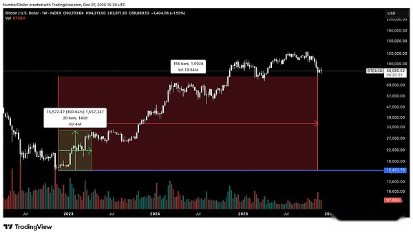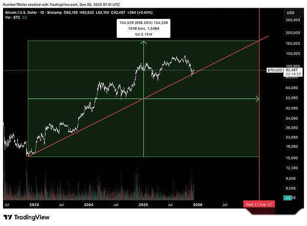Notarás constantemente la interacción entre precio y tiempo.Por lo tanto, es fundamental mirar hacia el futuro 155 días, 155 semanas y 1550 días. Vale la pena señalar que el mínimo más reciente se produjo en la semana 156, la penúltima semana del ciclo de tres años, que también coincide con el aniversario del mínimo del ciclo del 22 de noviembre.