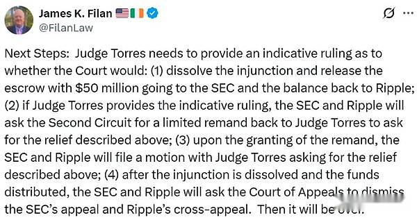 証券取引委員会からの5月8日の声明によると、SECとRippleは、ニューヨーク州の裁判所に共同和解状況を提出し、2024年8月のリップルに対する禁止の解除を求め、1億2,500万ドルの民事罰金の7,500万ドルを暗号通貨会社に返還しました。
