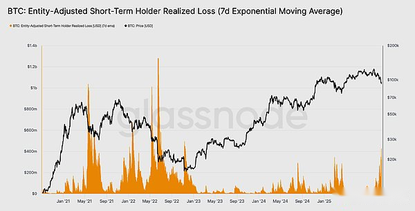 From the perspective of investor behavior, this plunge marks the third time since the beginning of 2024 that the currency price has fallen below the lower limit of the short-term holder’s cost basis model.However, the level of panic among top buyers is significantly higher this time around.STH’s 7-day moving average of realized losses has surged to $523 million daily, its highest level since the FTX crash.