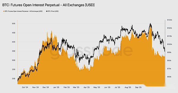Derivatives markets are signaling a clear reduction in speculative positioning as futures open interest continues to decline.Traders are closing positions rather than buying on dips, resulting in open interest leverage being significantly lower than during the previous decline.