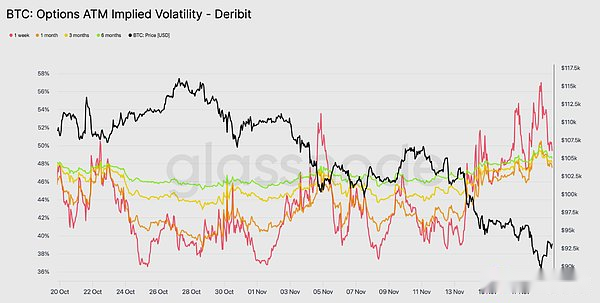 Options markets are often the first to reprice risk, and they did so quickly after Bitcoin briefly fell below $90,000.Implied volatility rose sharply across all tenors, with front-month options showing the strongest reaction.The chart shows a clear increase in short-dated options volatility, with widespread repricing across the options curve.