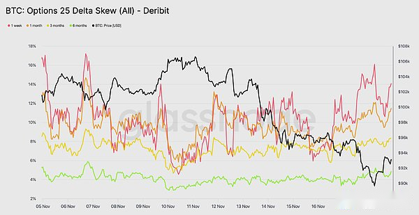 Moving from implied volatility to skewness, the options market sends the same message.The 25delta skewness remains negative across all tenors, with the one-week skewness approaching extremely bearish levels.The one-week put premium is around 14%, indicating that traders are willing to pay more for downside protection regardless of spot prices.