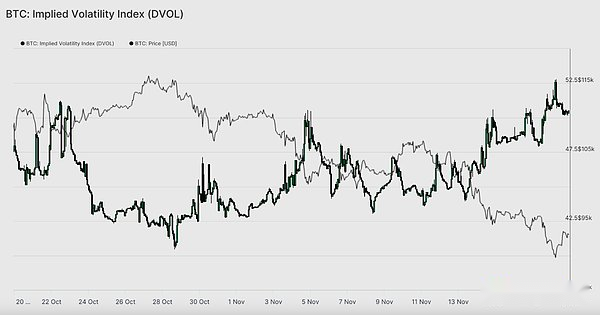 The DVOL Index shifts from individual option prices to a broader measure of volatility, reflecting the extent to which the market is repricing risk.The DVOL index has moved back toward monthly highs near 50 after trading near 40 three weeks ago.DVOL reflects the implied volatility of a basket of fixed-maturity options, so when the DVOL index rises, it signals that traders are expecting greater price moves in the future.