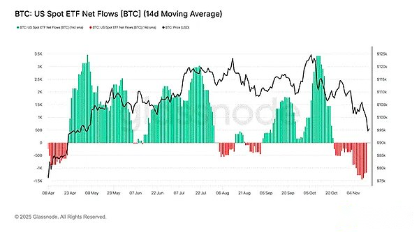 The chart above shows the annualized basis these funds would earn by buying IBIT US and selling CME futures contracts.While the chart above shows the Binance exchange, CME’s annualized basis is essentially the same.When basis spreads were significantly higher than the federal funds rate, hedge funds swarmed in, resulting in continued large net inflows into ETFs.This creates the illusion for those who don’t understand the market microstructure that institutional investors have a strong interest in Bitcoin exposure, when in fact they don’t care about Bitcoin at all and are only in it to get some extra yield above the federal funds rate.When the basis falls, they sell their positions quickly.Recently, the ETF market has seen large net outflows as basis declines.Now, retail investors believe that these institutional investors don’t like Bitcoin, creating a negative feedback loop that prompts them to sell, further reducing the basis, and ultimately causing more institutional investors to sell ETFs.