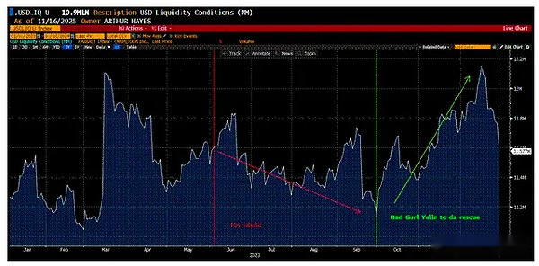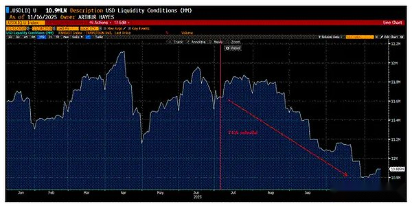 However, Bitcoin’s USD-implied liquidity expectations have worsened recently.Bitcoin prices have fallen 25% since their all-time highs in early October, with many altcoins falling even more than investors in the New York mayoral election.What changed all this?The Trump administration’s rhetoric has not changed.Trump still blasts the Fed for keeping interest rates too high.He and his staff continue to talk about stimulating the housing market through various means.And most importantly, Trump has compromised with China at every critical moment. He has been reluctant to reverse the trade and financial imbalances between the two largest economies, China and the United States, because the economic and political pain caused by this is too much for politicians who must face voters every two to four years.What also hasn’t changed is the shrinking dollar liquidity, which markets now take even more seriously than politicians’ rhetoric.