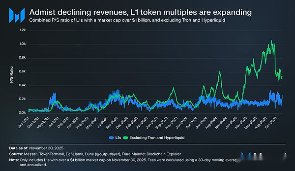Despite these competing valuation frameworks, the market increasingly prefers to value L1 tokens from a monetary premium perspective rather than a revenue-driven perspective.The overall price-to-sales ratio (P/S) of all L1 tokens with a market capitalization over $1 billion has remained relatively stable over the past few years, typically between 150x and 200x.However, this overall number is misleading as it includes Tron and Hyperliquid.Over the past 30 days, TRX and HYPE generated 70% of the category’s revenue but accounted for only 4% of the market capitalization.After excluding these two outliers, the truth is obvious: even as revenue declines, L1 valuations have been rising.Adjusted price-to-sales ratios also continued to move higher.
