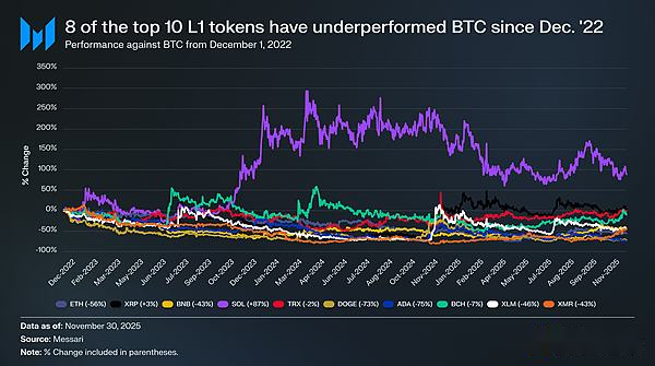 To better represent the performance of L1 tokens, we examined the performance of the top ten L1 tokens by market capitalization (excluding HYPE) relative to Bitcoin since December 1, 2022.These ten assets account for approximately 94% of the total market capitalization of the L1 token market and are therefore representative of the sector as a whole.Eight of these ten assets have underperformed Bitcoin in absolute terms during this period, with six trailing Bitcoin by 40% or more.Only two assets performed better than Bitcoin: XRP and SOL.XRP’s excess return is only 3%, which we wouldn’t overemphasize given that XRP’s historical capital flows have primarily come from retail investors.The only asset that significantly outperformed Bitcoin was SOL, which returned 87% more than Bitcoin.