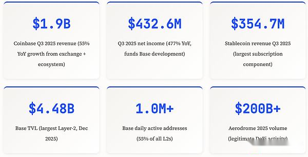 Diese Transformation wurde in der Finanzleistung von Coinbase im dritten Quartal 2025 quantifiziert, die sowohl die Gesundheit des Unternehmens mit kontinuierlichen Investitionen in das Ökosystem als auch den Beitrag von Base zur Umsatzdiversifizierung zeigt.Coinbase meldete einen Quartalsumsatz von 1,9 Milliarden US-Dollar (eine Steigerung von 55 % gegenüber dem Vorjahr) und einen Nettogewinn von 432,6 Millionen US-Dollar (eine Steigerung von 477 % gegenüber dem Vorjahr).Die Einnahmen aus Abonnements und Dienstleistungen (einschließlich Base-bezogener Aktivitäten und der Ausgabe von Stablecoins) haben nun zu einer Diversifizierung der Einnahmen über die Transaktionsgebühren hinaus geführt.Im dritten Quartal 2025 erreichten die Stablecoin-Einnahmen 354,7 Millionen US-Dollar (ein Anstieg von 6,7 % gegenüber dem Vorquartal) und wurden damit zum größten Bestandteil des Abonnement- und Dienstleistungssegments.Der Abonnement- und Serviceumsatz wird im vierten Quartal 2025 voraussichtlich 710 bis 790 Millionen US-Dollar erreichen, angetrieben durch die anhaltende Beliebtheit von USDC und das Wachstum des Ökosystems.