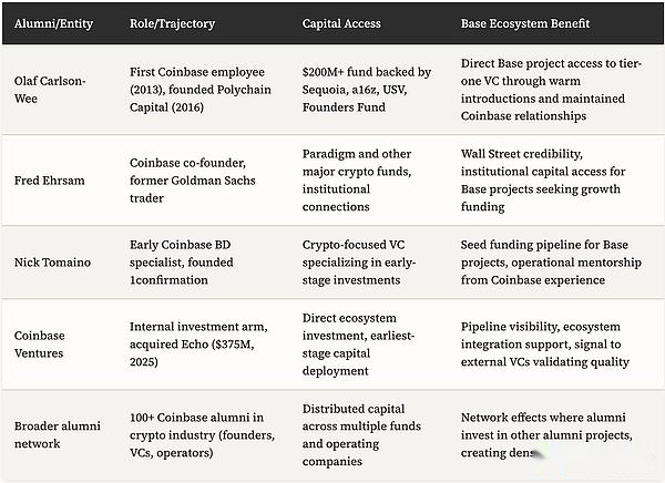 Das Alumni-Netzwerk von Coinbase bietet einen strukturellen Vorteil für das Base-Ökosystem, ähnlich wie die PayPal-Mafia (Peter Thiel, Elon Musk und Reid Hoffman) die strukturellen Vorteile nachfolgender Unternehmergenerationen durch Zugang zu Kapital, operatives Fachwissen und Einführungen geprägt hat.. Olaf Carlson-Wee war der erste Mitarbeiter, der 2013 bei Coinbase eingestellt wurde. Er verließ das Unternehmen 2016, um Polychain Capital zu gründen, das heute zu den weltweit größten Hedgefonds für Kryptowährungen zählt und 200 Millionen US-Dollar von Unternehmen wie Sequoia Capital, Union Square Ventures, Andreessen Horowitz und Founders Fund eingesammelt hat.Das Portfolio von Polychain umfasst Projekte im Base-Ökosystem, die von Kapitalinvestitionen und der Beziehung, die Carlson-Wee mit Führungskräften von Coinbase unterhält, profitieren und eine Projektpipeline aufbauen, die es Base-Projekten ermöglicht, eine schnellere Due-Diligence-Prüfung und günstigere Konditionen zu erhalten als ähnliche Projekte in anderen konkurrierenden Ketten.