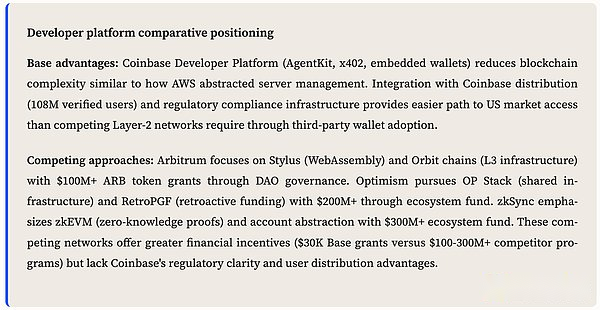 Die durch die Compliance-Infrastruktur von Coinbase etablierte regulatorische Positionierung von Base schafft einen asymmetrischen Vorteil, ähnlich wie die Überweisungslizenz von PayPal, beim Aufbau eines Burggrabens im Online-Zahlungsbereich.. Coinbase verfügt über Lizenzen in allen 50 US-Bundesstaaten und hat die Registrierung als nationale Wertpapierbörse bei der U.S.Securities and Exchange Commission (SEC) beantragt, hat außerdem eine Derivate-Registrierung von der U.S. Commodity Futures Trading Commission (CFTC) erhalten und ist als Broker-Dealer bei der U.S. Financial Industry Regulatory Authority (FINRA) registriert.Wenn dieses Compliance-Framework auf das Base-Ökosystem ausgeweitet wird, verwandelt es sich von einer reinen Kostenstelle (Hunderte Millionen Dollar an Rechts- und Betriebskosten pro Jahr) in einen strategischen Vermögenswert.Auf Base basierende Anwendungen können regulatorische Klarheit für den US-Marktzugang schaffen, die andere Layer-2-Netzwerke ohne ähnliche Compliance-Investitionen nicht bieten können.Angesichts der enormen Regulierungskosten bleiben solche Compliance-Investitionen für die meisten Blockchain-Infrastrukturanbieter wirtschaftlich untragbar.