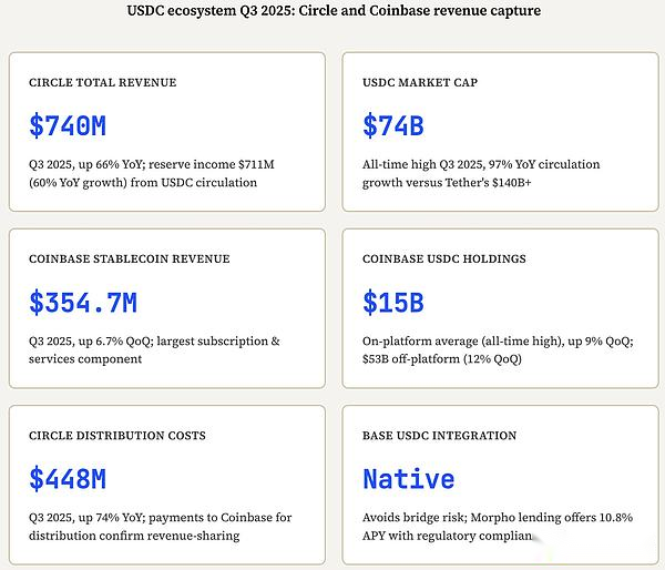 Die Finanzergebnisse von Circle für das dritte Quartal 2025 bestätigen das Gesamtwachstum des USDC-Ökosystems.Circle berichtete, dass seine Gesamteinnahmen und Reserveeinnahmen 740 Millionen US-Dollar erreichten (ein Anstieg von 66 % im Jahresvergleich), wobei die Reserveeinnahmen 711 Millionen US-Dollar erreichten (ein Anstieg von 60 % im Jahresvergleich), was hauptsächlich auf einen Anstieg des durchschnittlichen USDC-Umlaufs um 97 % zurückzuführen sei.Der Marktwert von USDC erreichte im dritten Quartal 2025 ein Allzeithoch von 74 Milliarden US-Dollar, gegenüber zuvor 61,3 Milliarden US-Dollar, was ihn zum zweitgrößten Stablecoin nach Tether macht (mit einem Marktwert von mehr als 140 Milliarden US-Dollar).Es ist erwähnenswert, dass die Vertriebskosten von Circle im Jahresvergleich um 74 % auf 448 Millionen US-Dollar gestiegen sind, wobei der Anstieg „hauptsächlich auf einen Anstieg der Vertriebszahlungen zurückzuführen ist, der einen Anstieg der USDC-Umlaufsalden und einen Anstieg der durchschnittlichen USDC-Bestände auf der Coinbase-Plattform widerspiegelt.“Diese Offenlegung bestätigt, dass Coinbase einen erheblichen Teil der Einnahmen aus dem Wachstum von USDC erhalten hat, was Coinbase dazu veranlasst, es als USDC-Vertriebskanal zu nutzen und eine finanzielle Grundlage für die Entwicklung des Ökosystems unabhängig vom spekulativen Token-Handel zu schaffen.