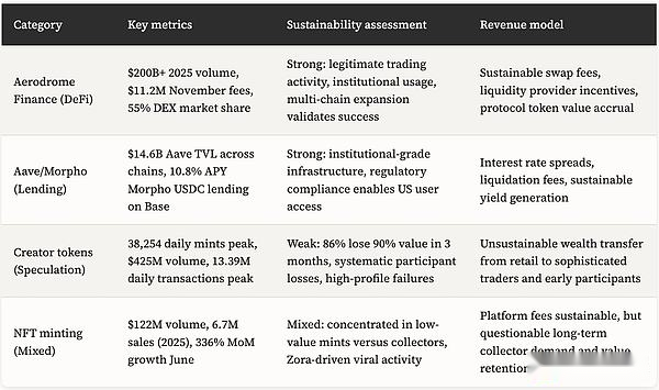 Das Base-Ökosystem weist einen grundlegenden Widerspruch zwischen konformer DeFi-Infrastruktur und spekulativer Token-Ersteller-Aktivität auf, ähnlich der Koexistenz nachhaltiger Geschäftsmodelle (Amazon, Google) und spekulativer Unternehmen (Pets.com, Webvan) während der Dotcom-Blase. Aerodrome Finance repräsentiert die Infrastrukturkategorie mit einem kumulierten Handelsvolumen von über 200 Milliarden US-Dollar bis 2025 (ein Anstieg um das Dreifache im Vergleich zum Vorjahr) und macht 55 % des gesamten Handelsvolumens der dezentralen Börsen (DEX) auf der Base-Plattform aus.Die Ergebnisse vom November 2025 zeigen, dass das Transaktionsvolumen 16 Milliarden US-Dollar erreichte, die anfallenden Bearbeitungsgebühren 11,2 Millionen US-Dollar erreichten und der Jahresumsatz etwa 136 Millionen US-Dollar betrug.Der Kapitalpool von Aerodrome trug im Jahr 2025 260 Millionen US-Dollar zum „On-Chain-BIP“ bei, was 44 % der gesamten Wirtschaftsaktivität der Base-Plattform ausmacht, was darauf hindeutet, dass sich seine Liquidität eher auf konforme Transaktionen als auf spekulatives Prägen konzentriert.