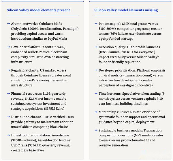 Die Vision des „Silicon Valley on the Chain“ erfordert, dass Base die Dynamik des unternehmerischen Ökosystems des Silicon Valley nachbildet:Hochwertige Gründer bauen nachhaltige Unternehmen auf, Risikokapital stellt geduldiges Kapital und operatives Fachwissen bereit, erfolgreiche Unternehmer betreuen nachfolgende Unternehmer durch Netzwerkeffekte und die Infrastruktur unterstützt schnelles Experimentieren und senkt Eintrittsbarrieren.. Base verfügt über mehrere notwendige Bestandteile, wie das Coinbase Mafia-Alumni-Netzwerk (Polychain, 1confirmation, Paradigm), eine Entwicklerplattform, die die technische Komplexität reduziert (AgentKit, x402, eingebettete Wallets), regulatorische Klarheit, die den Eintritt in den US-Markt ermöglicht (108 Millionen verifizierte Coinbase-Benutzer) und finanzielle Ressourcen für Ökosysteminvestitionen (Coinbases vierteljährlicher Umsatz von 1,9 Milliarden US-Dollar, Nettogewinn von 432,6 Millionen US-Dollar unterstützt Finanzierung und Akquisitionen, z. B. Echo-Übernahme im Wert von 375 Millionen US-Dollar).
