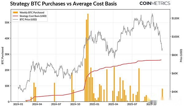 Strategy is currently the largest holder of Bitcoin DAT, with 649,870 Bitcoins (about 3.2% of the current Bitcoin supply), with an average purchase cost of $74,333.As shown in the chart below, when the price of Bitcoin rose and its asset valuation was strong, Strategy’s buying speed accelerated significantly, but it has slowed down recently and is not actively selling.Even so, Strategy is holding on to unrealized gains and its cost basis is below current market prices.