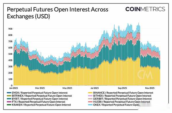 In just a few hours, the perpetual contract suffered the largest forced liquidation in history, wiping out more than 30% of the open positions accumulated over several months.The drop in open interest was most pronounced on altcoin and retail trading venues such as Hyperliquid, Binance, and Bybit, where leverage surged, consistent with the steepest leverage growth before the event.As the chart below shows, open interest remains well below its pre-crash high of over $90 billion and has declined slightly since.This suggests that leverage in the system is coming back down as markets stabilize and readjust.