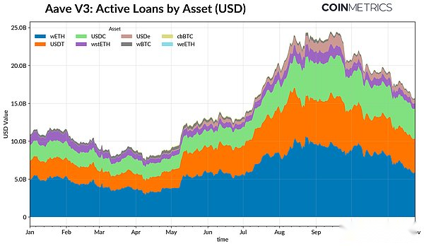 The DeFi credit market has also experienced a phase of gradual deleveraging.The number of active loans on the Aave V3 platform has trended downward since peaking in late September as borrowers reduce leverage and pay down debt amid weakening risk appetite and collateral repricing.Stablecoin-denominated borrowing has seen the most significant declines, a trend exacerbated by Ethena USDe’s dragging anchor, causing USDe borrowing volumes to drop by 65% and triggering wider leverage unwinding of synthetic USD.
