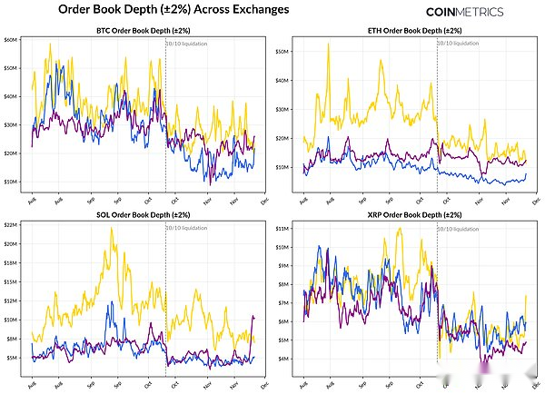 Liquidity conditions are even weaker for altcoins.In addition to mainstream coins, the order book depth of other coins has declined more sharply and for a longer period of time, reflecting the continued risk aversion of market participants and the reduction in market maker activity in mainstream coins and altcoins.An overall improvement in spot market liquidity would help reduce price shocks and stabilize market conditions, but for now, order book depth remains one of the clearest signs of continued stress in the system.