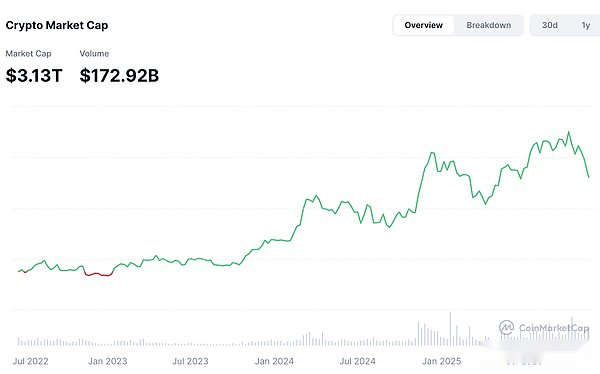 At the same time, the net inflow of small retail investors (≤10 BTC) is also slowly rising, which shows that although the most emotional novice users may be closing their positions in panic, another group of more experienced long-term retail investors are seizing the opportunity to increase their positions.The realized loss indicator on the chain even recorded the largest one-day loss record in the past six months. A large number of chips were forced to sell at a loss, and the typical “surrender selling” signal clearly emerged.Combining various on-chain indicators, what we see is not a complete withdrawal of the market, but a rapid redistribution of chips – from the concentration of short-term, emotional funds to entities with longer capital patience and stronger risk tolerance. This is a structural phenomenon that will appear in the middle and later stages of all previous bull markets.The market is currently in a period of high volatility in the second half of the bull market – although the market value has corrected but is still on a strong platform, sentiment has cooled significantly, structural differentiation has intensified, and high-quality assets are resisting the decline, but speculative assets continue to be cleared.The overall market capitalization of the crypto market is on a downward trend.