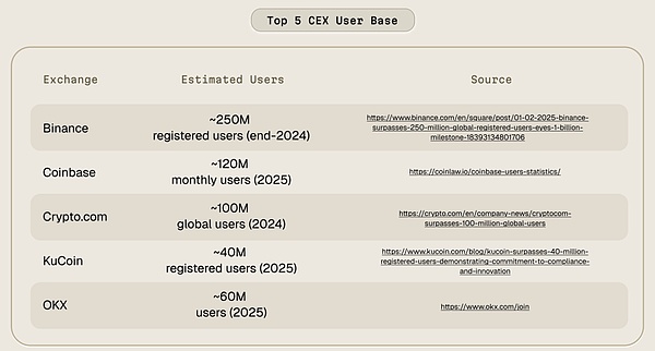 Finalmente, los cinco principales intercambios clasificados por la cantidad de usuarios registrados públicamente: Binance, Coinbase, Crypto.com, KuCoin y OKX.Los datos públicos muestran que el número total de cuentas registradas en las cinco bolsas supera los 500 millones.Sin embargo, una gran cantidad de usuarios abrieron cuentas repetidamente en múltiples plataformas, lo que generó cifras falsamente altas.Para llegar a una base realista de “personas reales”, adoptamos ajustes conservadores: suponiendo que las cuentas duplicadas representan alrededor del 55% al ​​60%, calculamos que el número de usuarios únicos de los cinco principales intercambios es de aproximadamente 200 a 230 millones.