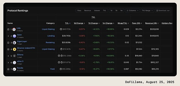 Para evitar confusión, excluimos los activos respaldados por intercambios como el compromiso de ETH de Binance y nos centramos en escenarios DeFi puramente en cadena.La fecha de la instantánea seleccionada es el 25 de agosto de 2025, que es representativa de la distribución reciente de usuarios y sirve como base para derivar audiencias de ingresos de DeFi.
