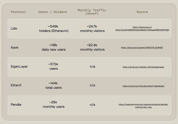 Bloqueamos los cinco protocolos principales en DeFi Llama en orden de TVL y utilizamos fuentes de datos públicos para contar la cantidad de direcciones de usuario en cada uno.Dado que no existe un estándar unificado en la cadena para una deduplicación precisa, solo confiamos en la información pública disponible para hacer estimaciones aproximadas.