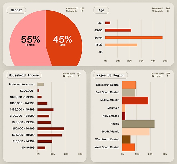 Esta encuesta está dirigida a la población minorista general de los Estados Unidos, con edades comprendidas entre 18 y 99 años, y que abarca todos los niveles de ingresos.Entre las 150 muestras válidas, alrededor de dos tercios (67%) han poseído y utilizado criptoactivos, y un tercio (33%) nunca ha estado expuesto.Para garantizar que las conclusiones se centren en el «comportamiento real», solo realizamos un análisis en profundidad de los 101 tenedores activos de divisas que han «estado en el círculo» para eliminar el ruido de experiencia cero.