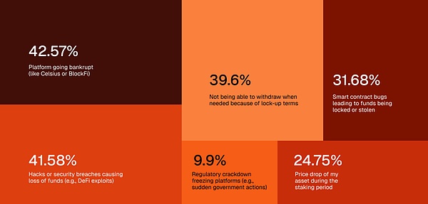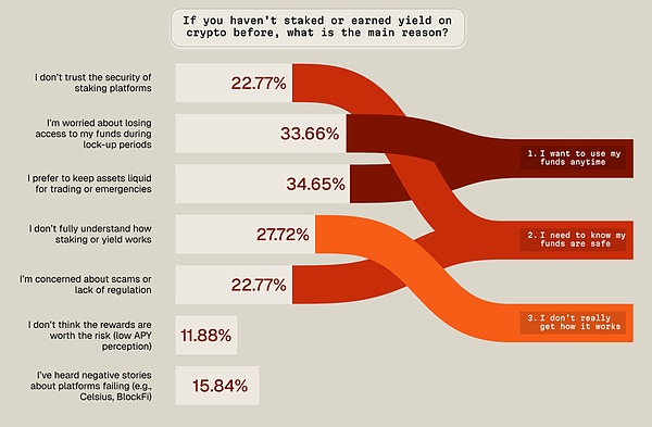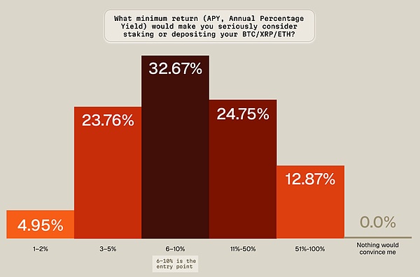 Las investigaciones muestran que los inversores minoristas son generalmente conservadores y miopes en sus decisiones sobre ingresos:Más del 60% ha mantenido criptoactivos durante menos de un año,Sólo los rendimientos que son mucho más altos que los de la gestión financiera tradicional pueden hacer que se muevan: la tasa anualizada del 6% es el «umbral mínimo de atractivo», y el APY de un solo dígito es difícil de impresionar..