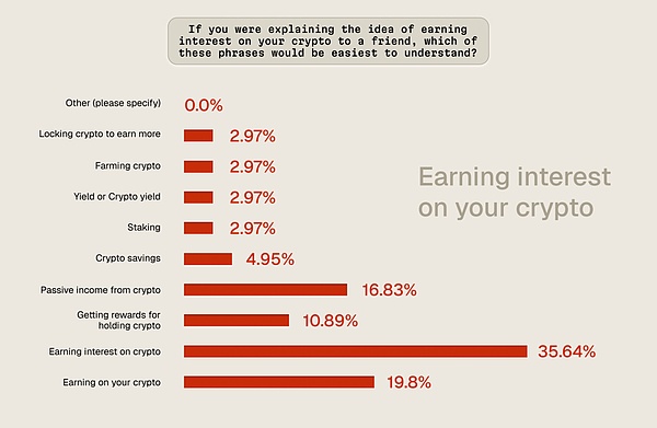 El lenguaje determina el umbral de comprensión.Cuando se preguntó a los inversores minoristas entrevistados qué afirmación era más fácil de entender, la abrumadora ganadora fue: «ganar intereses sobre su criptografía».- Compara directamente los ahorros bancarios y no requiere conocimientos técnicos adicionales.