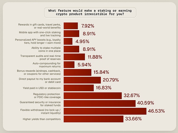 La confianza y la liquidez son el alma.Casi la mitad de los encuestados admitió que la principal razón por la que no se atrevían a involucrarse en productos de ingresos era «el miedo a no poder mencionarlo», seguido de preocupaciones por la seguridad y la incapacidad de comprenderlo.La capacidad de retirar dinero en cualquier momento y la protección de los fondos son más importantes que la tasa de rendimiento..Cuando se les preguntó qué características harían que un producto rentable fuera «irresistible»,Canje flexible e instantáneo sin bloqueoEncabeza la lista, seguido de avales de seguridad como seguro o custodia; la tasa de rendimiento en sí misma sólo ocupa el tercer lugar.