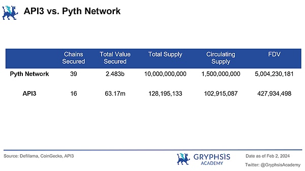 À partir de ces données, nous pouvons voir que le réseau Pyth a des avantages plus importants dans la profondeur et la couverture de l’intégration actuelles.Cependant, cela ne signifie pas que l’API3 manque de compétitivité.À l’avenir, avec le développement continu de la technologie de la blockchain et l’augmentation des scénarios d’application, API3 peut étendre sa part de marché en augmentant les liens intégrés, le support de protocole et l’augmentation de sa garantie de valeur.