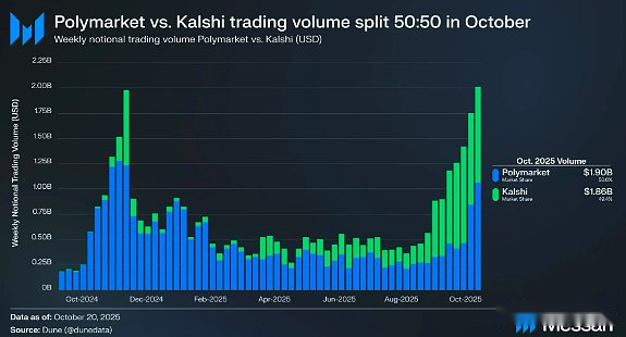 Die Handelsaktivitäten bleiben synchronisiert.In der ersten Oktoberhälfte erreichte das fiktive Handelsvolumen von Polymarket 1,9 Milliarden US-Dollar.Knapp dahinter folgt Kalshi mit 1,8 Milliarden US-Dollar.Das jährliche Handelsvolumen beider Börsen wird voraussichtlich mehr als 45 Milliarden US-Dollar erreichen.