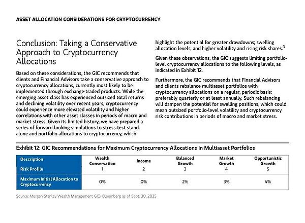 El sistema de cartera automatizado de la empresa rastrea la exposición a los criptoactivos de cada cliente en tiempo real para evitar una concentración excesiva.El Consejo Global de Inversiones de Morgan Stanley recomienda, para inversores jóvenes o agresivos, una asignación del 4% a una cartera de «Crecimiento Oportunista», del 2% a una cartera de Crecimiento Equilibrado y del 0% a una estrategia de preservación o de ingresos.