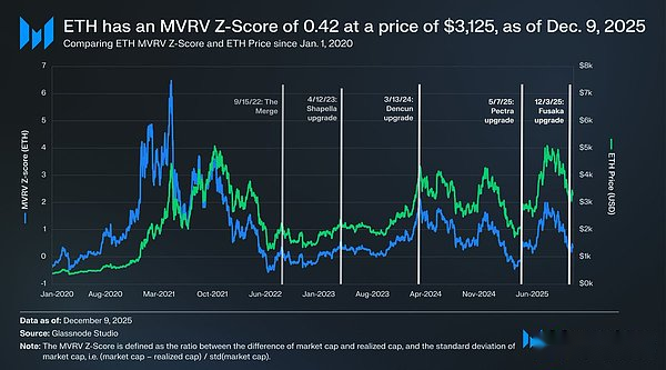 Während des NFT-Booms von 2021 bis 2022 stieg der MVRV-Z-Score der ETH einmal auf fast 6, was die extreme Begeisterung des Marktes zeigt. Seit der Ethereum-Fusion ist die Kennzahl auf den Mittelwert zurückgekehrt und schwankt nun hauptsächlich zwischen 0 und 2 – 0 ist unterbewertet, 1 liegt nahe am fairen Wert und 2 ist überbewertet.Am 7. Mai 2025, als Pectra, ein wichtiges technisches Upgrade von Ethereum, auf den Markt kam, lag der Preis der ETH bei etwa 1.800 US-Dollar und der MVRV-Z-Score bei etwa -0,1.Da die Preise seitdem Rekordhöhen erreicht haben, ist der MVRV allmählich näher an 2 geklettert.Nach dem Fusaka-Upgrade am 3. Dezember 2025 wurde ETH bei etwa 3.189 US-Dollar mit einem MVRV-Z-Score von 0,47 gehandelt, was darauf hindeutet, dass es auf einem deutlich höheren Preisniveau weiterhin unterbewertet bleibt, was auf eine ähnliche Marktstruktur nach dem Upgrade hindeutet, jedoch mit einer robusteren fundamentalen Positionierung.