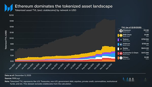 On-Chain-Daten stärken die bullische Logik von Ethereum weiter.Im Bereich der Asset-Tokenisierung ist Ethereum die zentrale Abwicklungsschicht.Laut Daten von RWA.xyz (Stablecoins sind von der Statistik ausgenommen) verfügt Ethereum über einen tokenisierten Gesamtwert von 11,9 Milliarden US-Dollar, was 65,9 % des Marktanteils entspricht.Obwohl sich andere Basisschichten und Rollups entwickelt haben, sind sie weit von der Skala entfernt.Während Institutionen Staatsanleihen, Kredite und andere reale Vermögenswerte auf Kryptokanäle verlagern, um die Kapitaleffizienz zu verbessern und die Betriebskosten zu senken,Die Liquidität, das Tool-Ökosystem und die Compliance-orientierte Infrastruktur von Ethereum vertiefen ihren Burggraben weiter.
