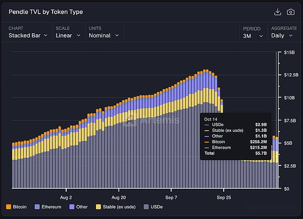 As of2025Year9moon, Pendle’s total lock-up value TVL breaks through130billion US dollarspeak value, whereUSDeThe highest proportion (approximately80billion U.S. dollars), the rest is made up of other stablecoins, BTC and ETH.