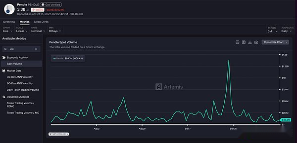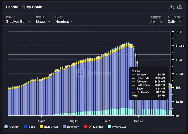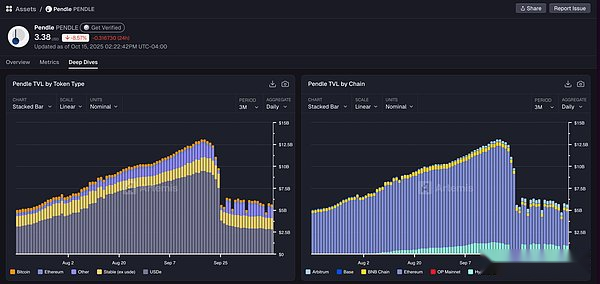 Pendle’s liquidity structure is highly subject tonarrative driven.In the early days, it was dominated by ETH (LST/LRT stage), then turned to BTCFi, and nowStablecoins account for more than78%.This demonstrates the strong demand for predictable, sustainable returns.The peak fluctuations and corrections in September 2025 reflect the liquidation wave of large expiration cycles.