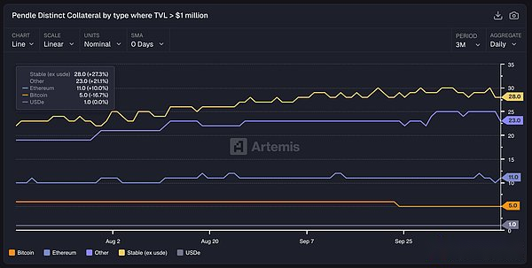 Pendle’s collateralized asset base has expanded significantly, with the stablecoin leading the way with 28 collateral types (+27%), underscoring its position as a pillar of the protocol’s growth.Ethereum (11 types, +10%) and other assets (23 types, +21%) continue to provide diversified support.This diverse landscape shows that Pendle is evolving intoMulti-asset income trading market, which can flexibly capture new narratives while always anchored by the reliability of stablecoins.