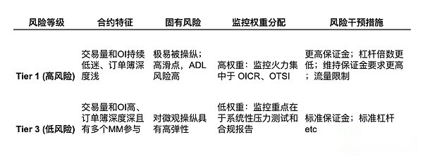 Categoría El modelo de los intercambios tradicionales, especulamos que los intercambios también deberían adoptar un modelo de gobernanza jerárquica para garantizar que las medidas de control de riesgos coincidan con la vulnerabilidad inherente del contrato.Llevar a cabo una gestión del nivel de riesgo de los contratos y centrar los recursos de seguimiento en los «contratos de alto riesgo» (Nivel 1), porque los manipuladores sólo necesitan utilizar menos capital en estos contratos para ejercer un impacto desproporcionado en los precios.