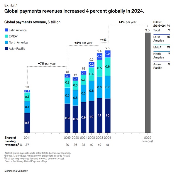 Los ingresos por pagos globales crecerán a una tasa anual promedio del 7% entre 2019 y 2024. Los ingresos por intereses representarán el 46% de los ingresos totales en 2024, impulsados ​​por tasas de interés más altas.El crecimiento cayó al 4% en el año, significativamente menos que el 12% en 2023. Las razones de la desaceleración incluyen el pico de las tasas de interés, el debilitamiento de la macroeconomía, la expansión estructural de los métodos de pago de bajo rendimiento y la continua reducción de las tarifas.