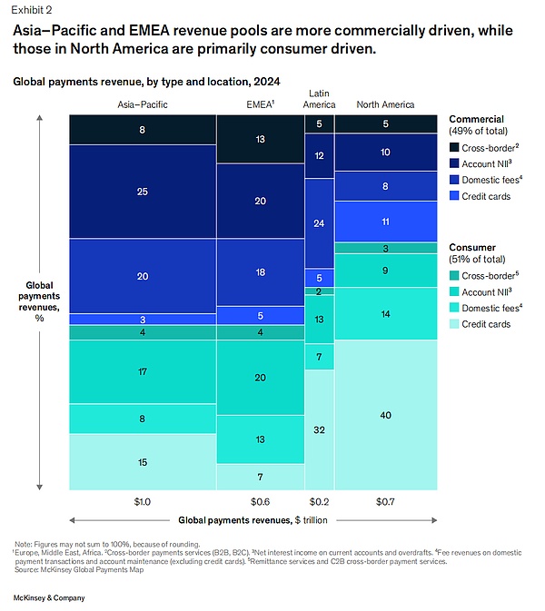 En general, los ingresos por pagos globales se dividen casi equitativamente entre los consumidores y el sector comercial, pero existen diferencias significativas en la composición de cada región.
