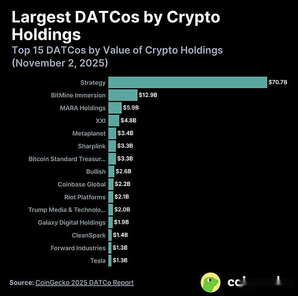 In diesem Jahr wurden etwa 76 neue DATs gegründet, mit einem Gesamtbestand von 137 Milliarden US-Dollar (82 % BTC).Über 82 % der Vermögenswerte befinden sich in BTC, etwa 13 % in ETH und der Rest verteilt sich auf verschiedene Altcoins.