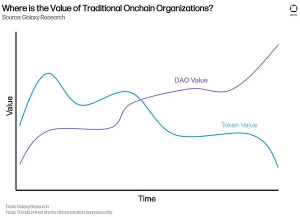 El resultado es una división del valor entre el capital de la empresa y los tokens emitidos por la DAO, en paralelo entre sí.Las entidades fuera de la cadena capturan valor económico como todas las empresas (por ejemplo, a través de propiedad intelectual, contratos de servicios e ingresos generados por la aplicación subyacente), mientras que los tokens dentro de la cadena acumulan valor principalmente a través de la utilidad dentro de la aplicación, la influencia de la gobernanza o la especulación directa.Como resultado, a los tokens de la DAO se les asigna un valor diferente al de la participación de su «envoltorio legal».