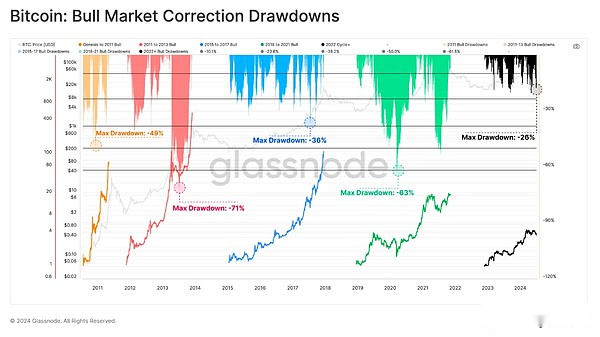 Après l’accident de la FTX, le marché a connu 18 mois de hausse et 3 mois de négociation latérale et a connu les ajustements les plus profonds de ce cycle.Malgré cela,Par rapport au cycle historique, la baisse du cycle actuel est toujours favorable, ce qui indique que l’infrastructure du marché est relativement stable.