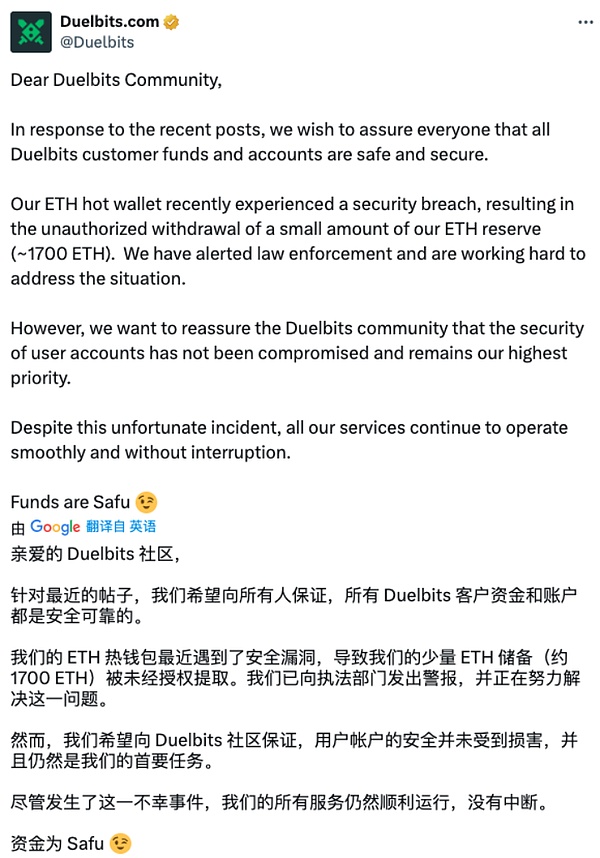 On February 14, 2024, the hot wallet of the crypto-gambling platform Duelbits was attacked, losing about $4.6 million. The reason for the stolen was suspected to be the leakage of the private key.